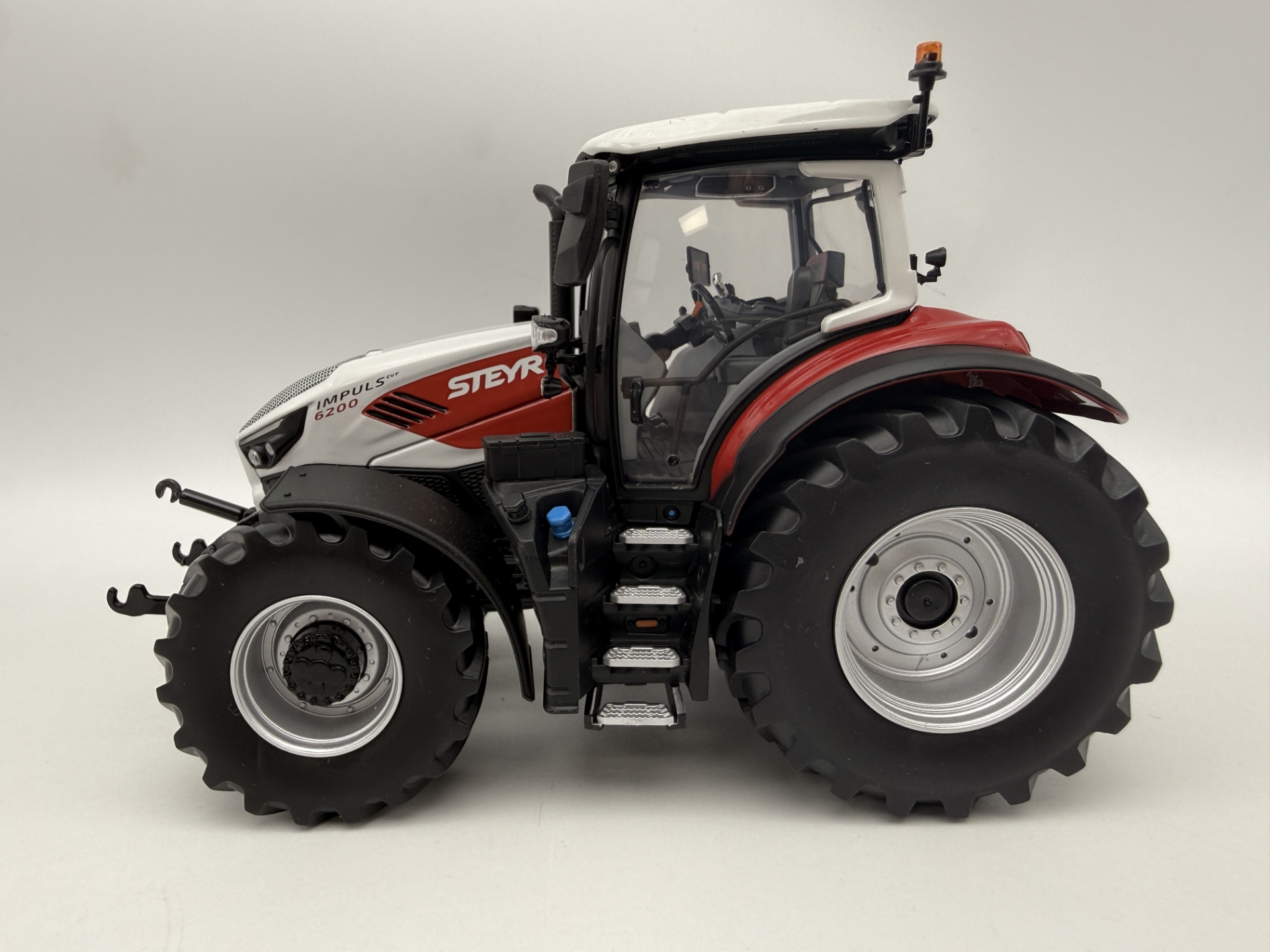 The Steyr 6200 Impuls is made of 167 parts and 220 tampoprinting operations. The outside mirrors and the rear warning signs are foldable and the inside of the cabin is very detailed: steering wheel, joystick, armrest.... There are a front and a rear coupling system with adjustable third point linkage. All the artworks on the hood and roof are tampoprinted. This item in 1/32 scale is made in die cast: this is a very nice and accurate replica of the real tractor.